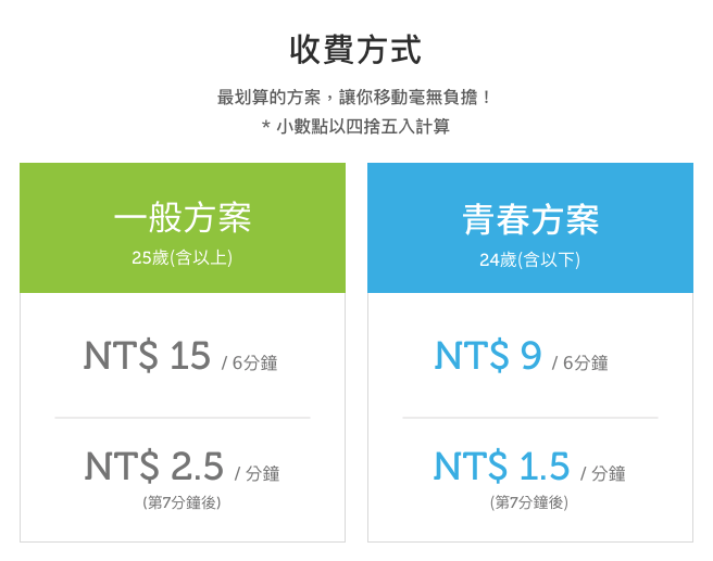 ■ 青春方案 (24歲含以下):前6分鐘$9元,第7分鐘起每分鐘$1.5元。